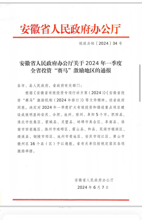 根据2024年6月7日皖政办秘【2024】34号《安徽省人民政府办公厅关于2024年一季度全省投资“赛马”激励地区的通报》,我区荣获2024年一季度全省投资“赛马”激励地区,全省104个县区中16个被表彰的县区之一,全市县区唯一,也是我区第四次荣获省投资“赛马”殊荣。
