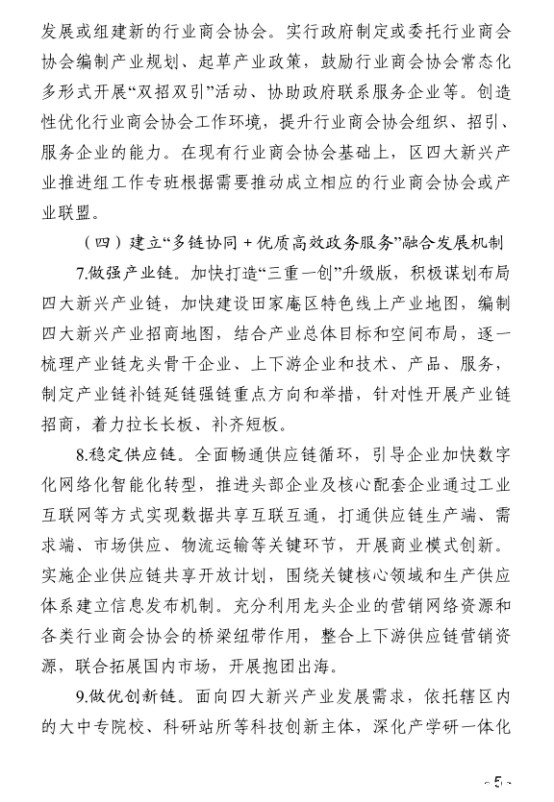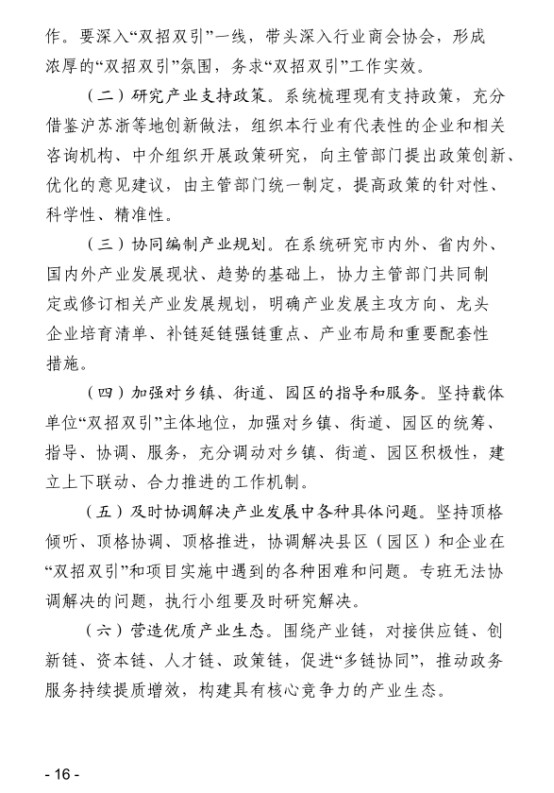 编制产业链招商规划,重点明确“建链、补链、强链”的关键环节。聚焦具有示范带动效应的重大项目,或处于产业发展前沿,拥有自主知识产权、有望形成爆发式增长的产业,坚持以“链”招商,准确把握产业发展趋势和项目重点。大力培育引进发展一批规模大、实力强的骨干企业及“成长性高、创新力强、特色突出”的一批中小企业;特别是聚焦原材料的工艺制造,培育引进一批行业单打冠军、隐性冠军。