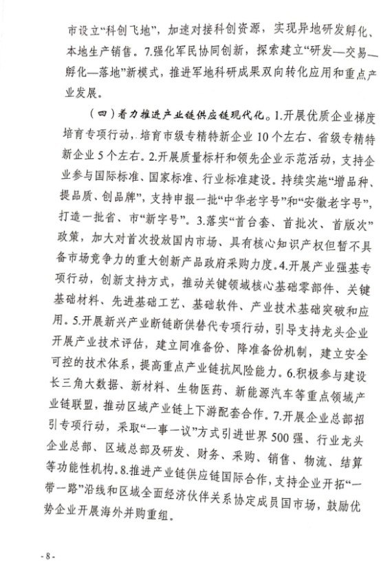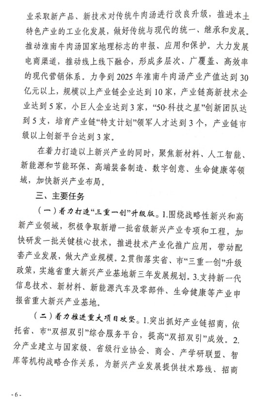 ——实现高水平“规模化”。以淮南牛肉汤重点企业和淮南牛肉汤产业园为抓手,推动产业规模化发展,加快扩大企业、园区生产能力,进一步扩大淮南牛肉汤产业生产能力,为相关门店开设提供上游原材料支持,力争到2025年,淮南牛肉汤规模以上工业企业达到15家以上,年产值30亿元以上,纳入统计的示范点门店年营业额达到100亿元以上。