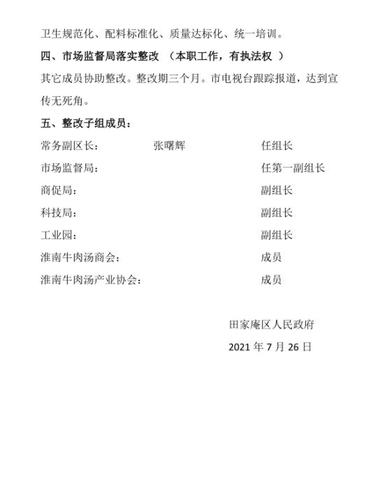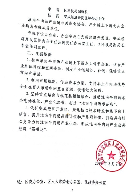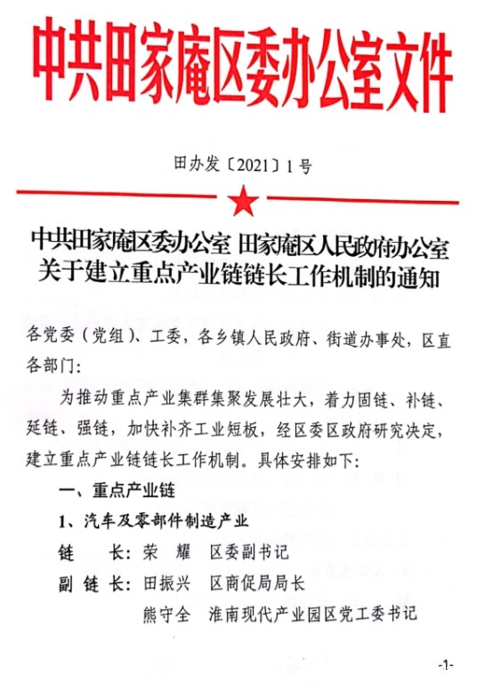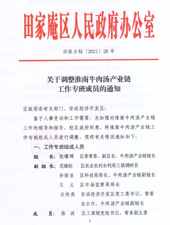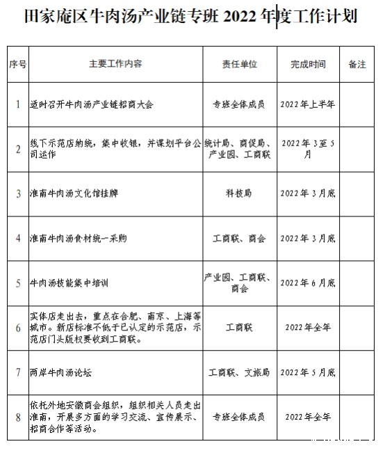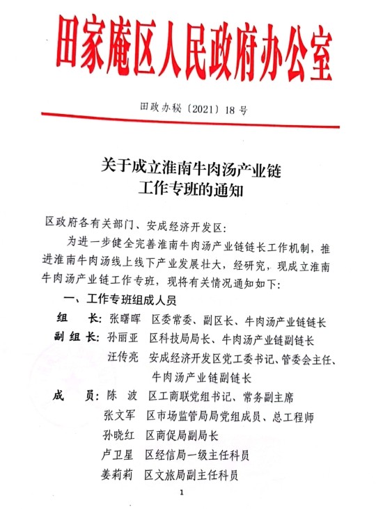目前,田家庵区已经设立淮南牛肉汤产业链链长制,链长由区位常委、副区长担任,区发改、区科技等部门参与。加快研究,进一步推进产业链链长制升级,设立淮南牛肉汤产业改革创新产业专班,由区长亲自担任专班组长,统筹协调淮南牛肉汤改革创新相关的重大事项、重点工作。高规格推动重点保障重大任务的项目实施,以转变政府职能为核心,完善工作机制,狠抓项目落实,为企业提供全方位、全天候、全过程保姆式服务。针对在建项目,全力做好项目建设过程中的各项协调工作,全面推进各个项目加快落地见效。