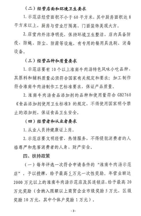 推进淮南牛肉汤标准化建设,加快认定推广一批优质示范门店。其中重点标准如下:示范店经营面积不小于60平方米,其中厨房面积达8平方米以上,厨房与营业厅隔离,门面装饰美观大方。示范店要有10个以上淮南牛肉汤特色风味小吃品种,其原料和辅料质量必须符合国家有关规定和要求;加工制作符合淮南牛肉汤制作工艺标准要求,保证产品质量;同时,示范点必须拥有商标等自主知识产权,年营业额达200万元以上、纳入区限额以上商贸单位统计库。此外,还包括环境卫生等标准、和相关要求条件。积极鼓励适合条件的门店加入地方集体品牌,将更多的门店纳入统一统计、管理、运营,加大对新纳入门店的奖励力度,对于新认定的门店予以授牌,给予最高5万元一次性奖励;年营业额达2000万元以上的淮南牛肉汤示范店及其连锁店,给予最高20,万元奖励(含纳入限额以上商贸企业市级奖励5万元,区级奖励10万元,其中个体户奖励1万元)。力争到2025年,在全省范围内新认定100家以上标准化示范店。