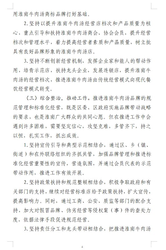 ——实现高质量“品牌化”。以淮南牛肉汤地方集体品牌为重点建设载体,加快整合淮南市内外有关品牌,推动以集体品牌建设为标准,实现品牌统一管理、统一示范、统一应用,把淮南牛肉汤打造为国内知名的地方特色餐饮品牌。