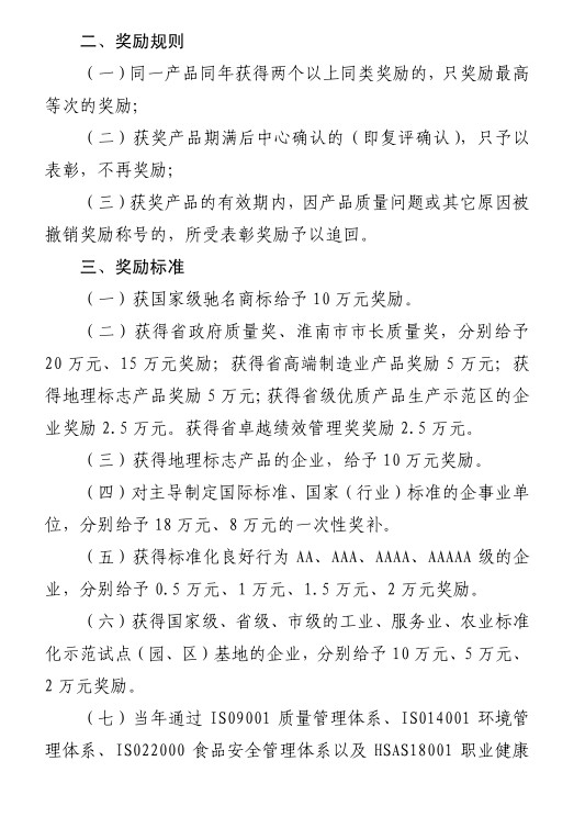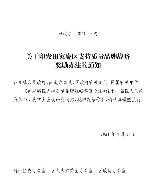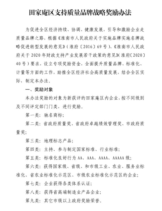 近年来,田家庵区把发展现代服务业作为未来现代产业体系的核心,持续加大政策支持力度。例如,2021年,出台《田家庵区支持质量品牌战略奖励办法》,对获得国家级、省级、市级的服务业示范试点(园、区)基地的企业,分别给予10万元、5万元、2万元奖励。对获国家级驰名商标给予10万元奖励;获得省政府质量奖、淮南市市长质量奖,分别给予20万元、15万元奖励;获得省高端制造业产品奖励5万元;获得地理标志产品奖励5万元;获得省级优质产品生产示范区的企业奖励2.5万元;省卓越绩效管理奖奖励2.5万元;对获得地理标志产品的企业,给予10万元奖励。
