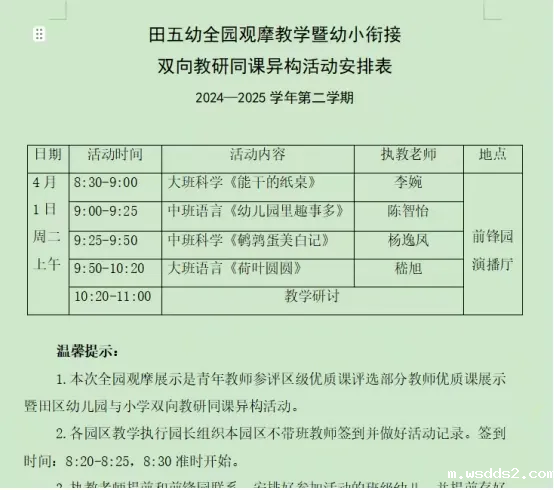 春意盎然,教研融融!为了深入落实上级教育部门关于加强科学幼小衔接工作的精神,进一步提高教师组织集体教育教学活动的能力,促进教师专业成长,田五幼于2025年4月1日,开展了以“同研,共进,共成长”为主题的观摩教学暨幼小衔接双向教研同课异构活动。此次活动旨在通过教师间的深度交流与合作,探索更加科学有效的幼小衔接方法,为孩子们的健康成长奠定坚实基础。