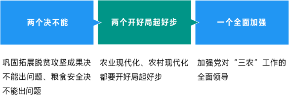 “两个决不能”就是巩固拓展脱贫攻坚成果决不能出问题、粮食安全决不能出问题。强调设立衔接过渡期,实现巩固拓展脱贫攻坚成果同乡村振兴的有效衔接,确保守住不发生规模性返贫底线。明确要求各地稳定粮食播种面积、提高单产水平,确保粮食产量稳定在1.3万亿斤以上。