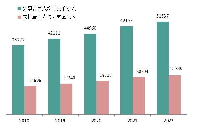 图5 2018-2022年田家庵区城乡常住居民人均可支配收入(单位:元)