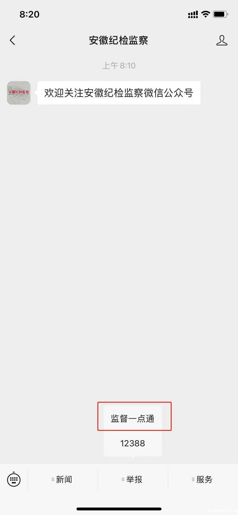 2、进入下方“安徽纪检监察 ”微信公众号菜单栏,点击“举报”,选择“监督一点通”进入服务平台。