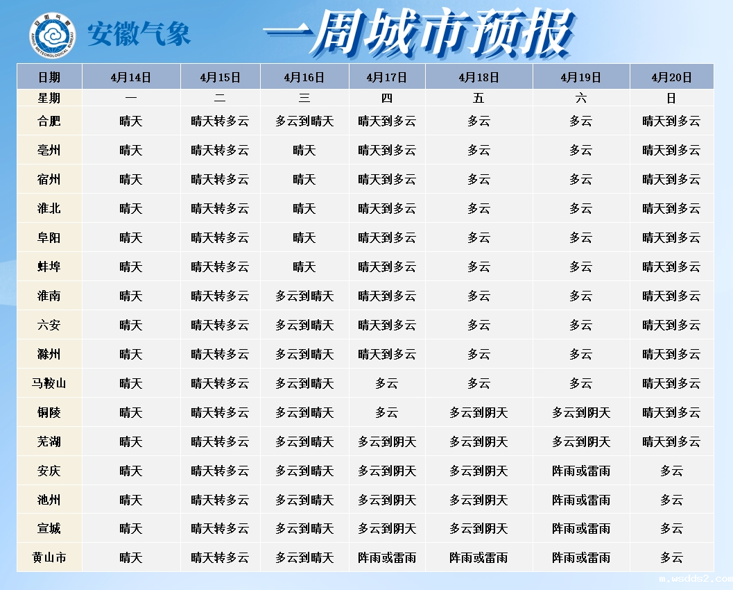安徽省气象台预计,17日至19日安徽南部多阵雨或雷雨天气,21日全省有一次雷阵雨天气过程,其中大别山区和沿江江南部分地区中到大雨,其余时段全省以晴到多云天气为主。