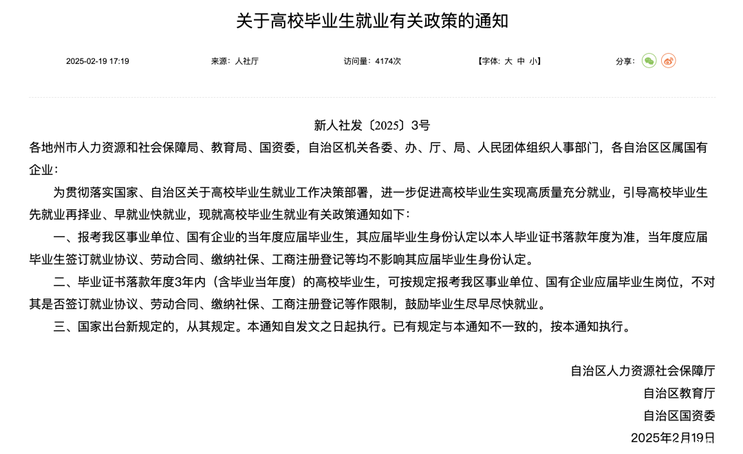 近日,新疆也明确放宽事业单位、国有企业招考应届生认定标准。