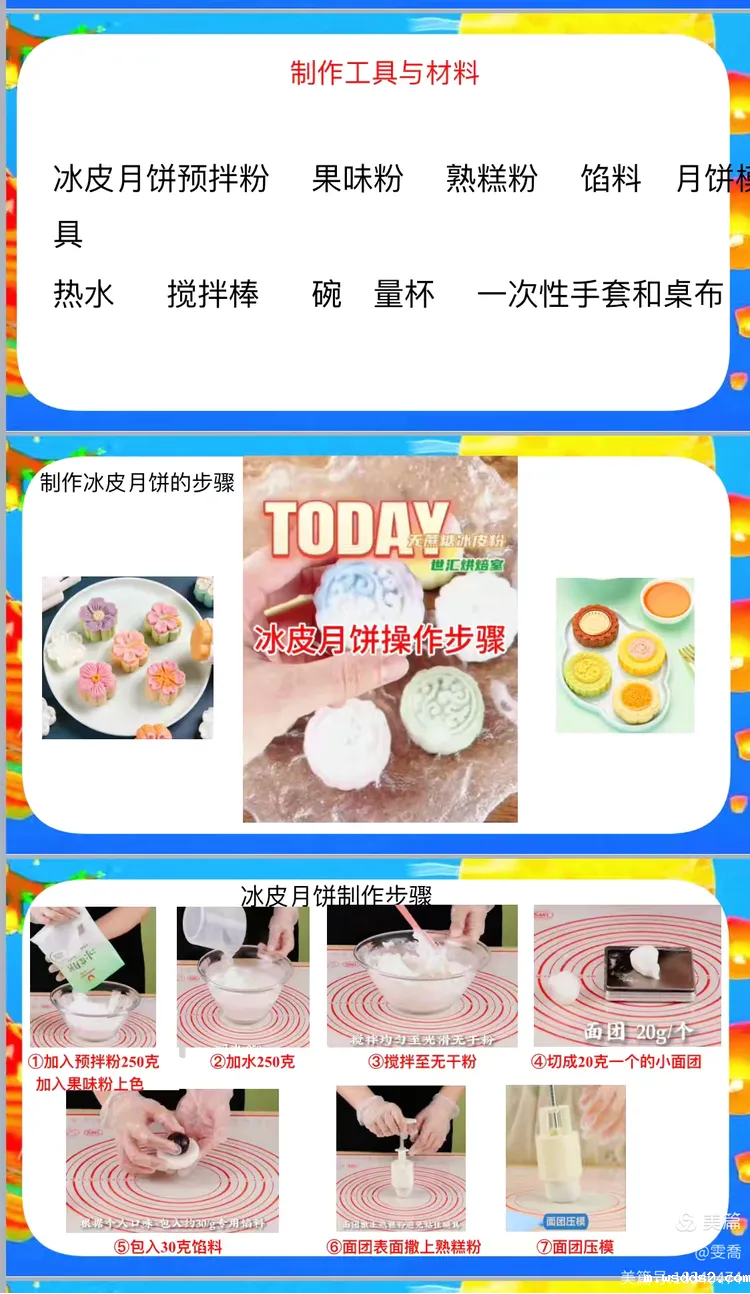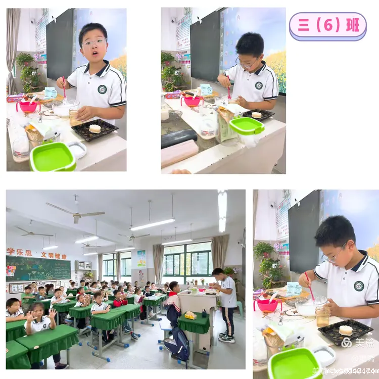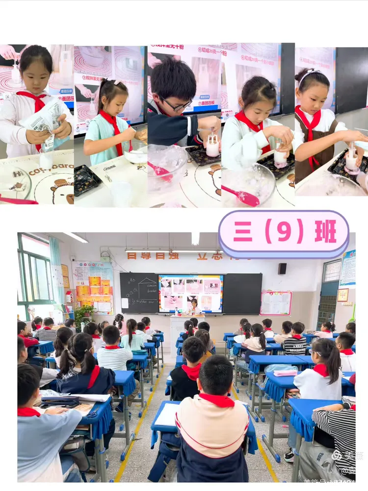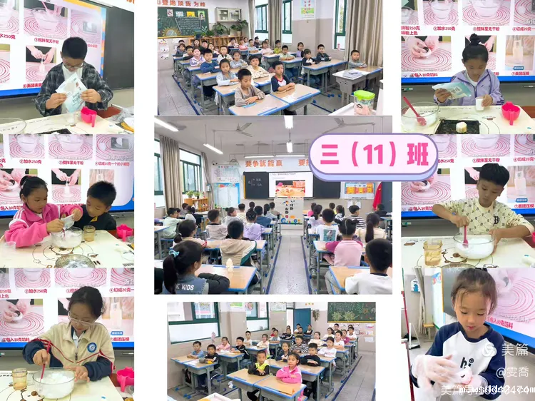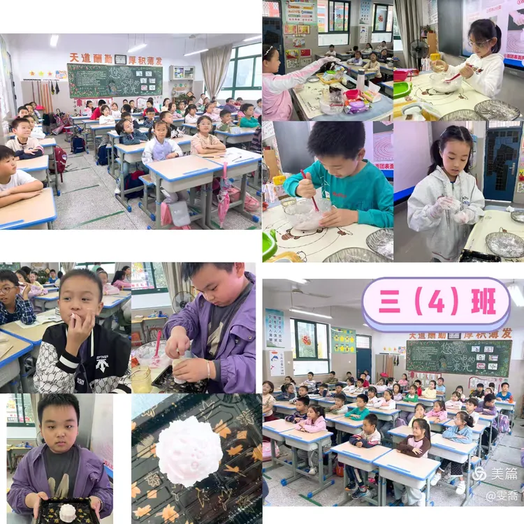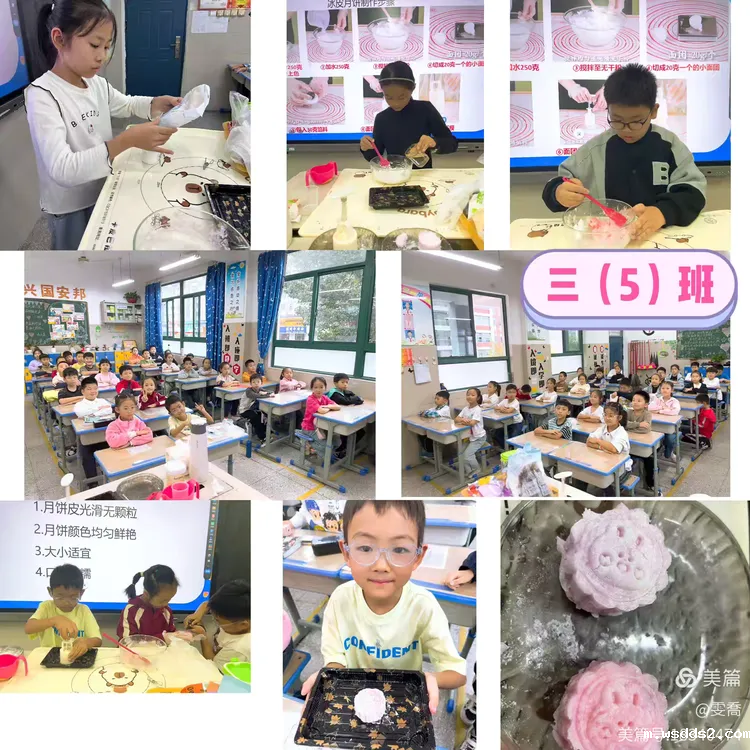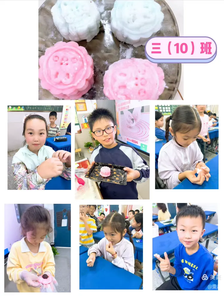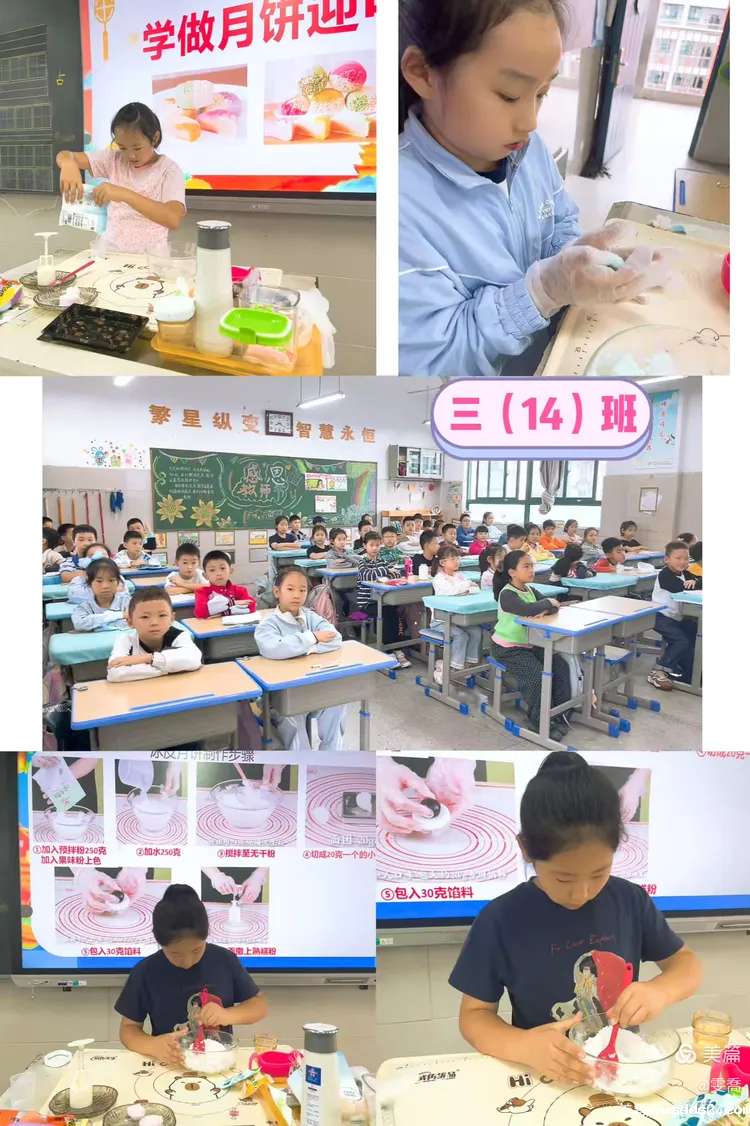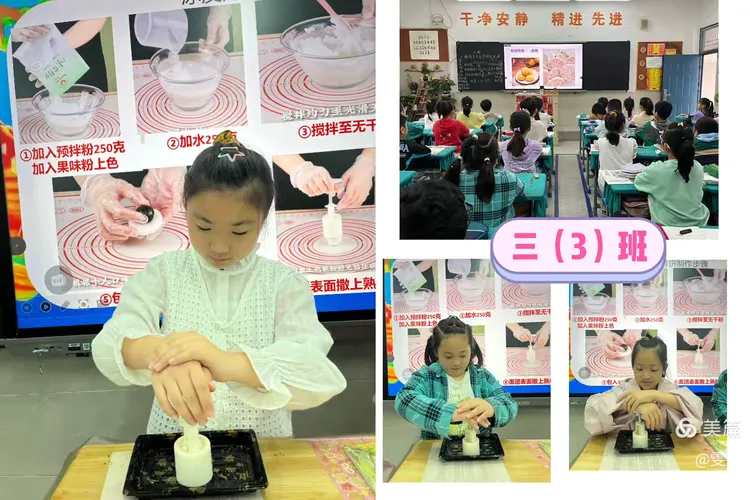 第二课时聚焦“冰皮月饼的制作”,突出学科实践与手脑并用。课程以“做中学”为核心理念,设置准备材料、操作演示、学生实践与成果展示四个环节。教师通过示范讲解,引导学生掌握制作流程与操作要点;学生则在亲身体验中运用所学知识,完成从原料调配到成型装饰的全过程。过程中,学生不仅锻炼了劳动技能,更在合作、反思与调整中发展了解决问题的能力,体现了“身心参与、手脑并用”的劳动教育原则。