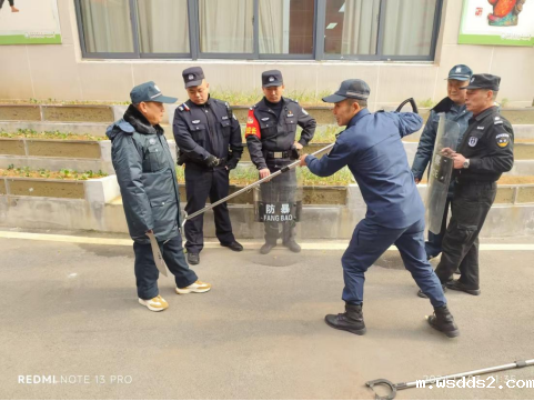 他重点对防暴钢叉,脚叉抓捕器,防暴盾牌的使用进行了讲解并现场和保安人员进行演练