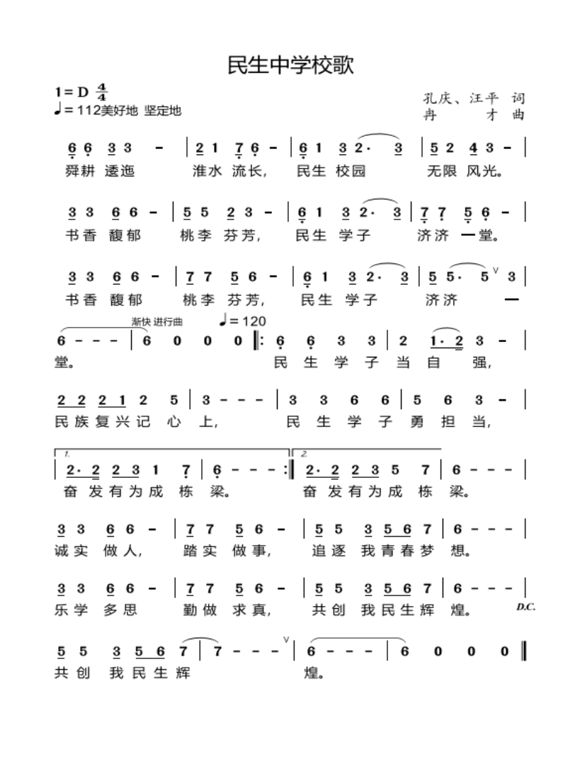 (二)淮南市田家庵区民生中学校歌: