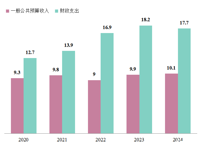 2024年,累计完成一般公共预算收入10.1亿元,增长1.9%,其中:增值税完成4.3亿元,下降16.4%。