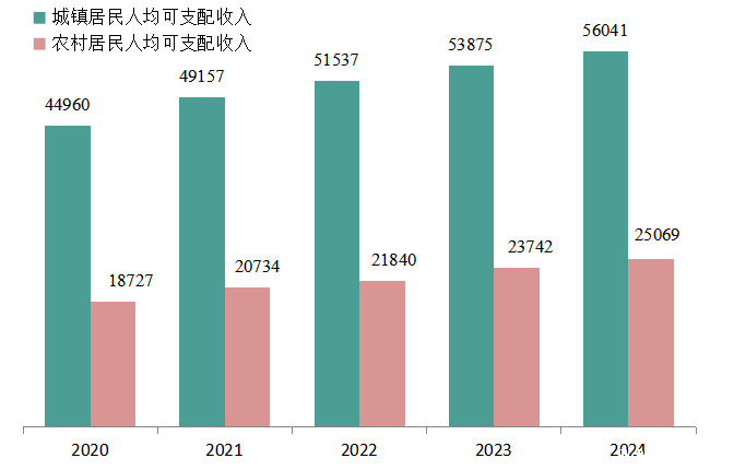 图4 2020-2024年田家庵区城乡常住居民人均可支配收入(单位:元)