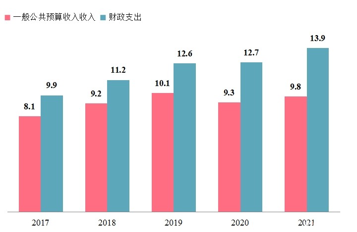 2021年,累计完成一般公共预算收入9.8亿元,增长5.4%,其中:增值税完成3.9亿元,下降2.0%。
