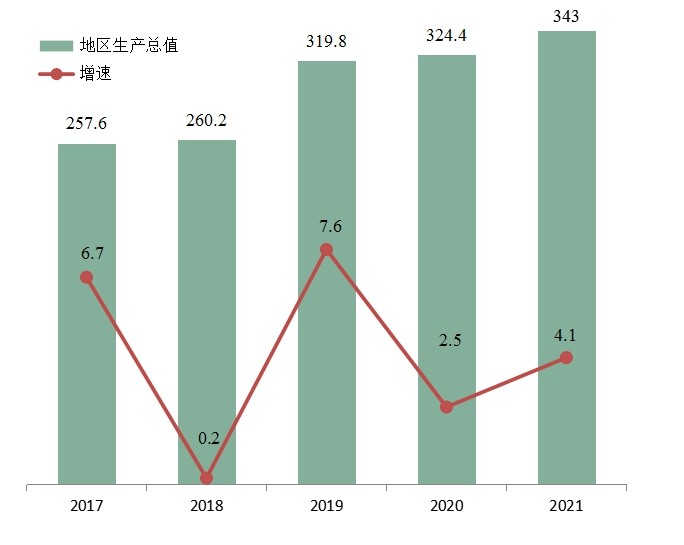 图1 2017-2021年GDP总量及增速(单位:亿元,%)