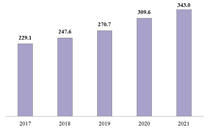 图3 2017-2021年田家庵区社会消费品零售总额(单位:亿元)