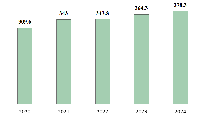 图2 2020-2024年田家庵区社会消费品零售总额(单位:亿元)