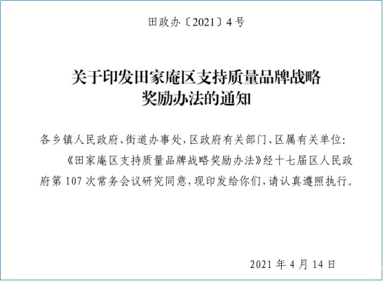近年来,田家庵区把发展现代服务业作为未来现代产业体系的核心,持续加大政策支持力度。例如,2021年,出台《田家庵区支持质量品牌战略奖励办法》,对获得国家级、省级、市级的服务业示范试点(园、区)基地的企业,分别给予10万元、5万元、2万元奖励。对获国家级驰名商标给予10万元奖励;获得省政府质量奖、淮南市市长质量奖,分别给予20万元、15万元奖励;获得省高端制造业产品奖励5万元;获得地理标志产品奖励5万元;获得省级优质产品生产示范区的企业奖励2.5万元;省卓越绩效管理奖奖励2.5万元;对获得地理标志产品的企业,给予10万元奖励。