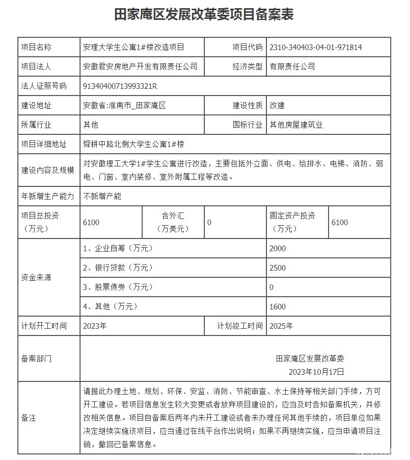 安理大学生公寓1#楼改造项目备案表