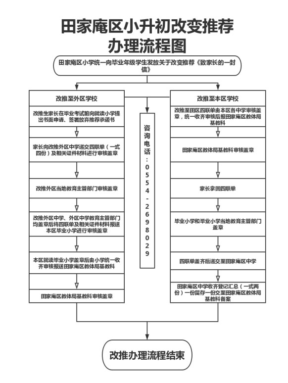 严格按照省市文件精神和我区小学毕业推荐方案,公示对口小学推荐升入初中的学生名单,并以公示名单办理初中新生入籍。不在公示名单中的2022级初中入学新生,三年后将不得享受省示范高中招生指标分配资格。小学对口推荐要严格把关,不参与对口推荐的要报送书面报告说明原因,原则上必须在户籍所在地就读初中,到外地就读的须提供外地户口簿及房产证,严禁同城借读,符合改变推荐条件的办理流程见下图: