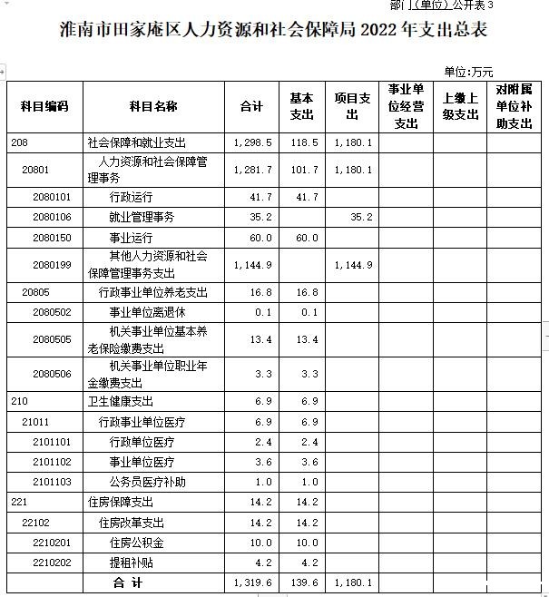 按照综合预算的原则,淮南市田家庵区人力资源和社会保障局所有收入和支出均纳入部门预算管理。淮南市田家庵区人力资源和社会保障局2022年收支总预算1319.6万元,收入全部是一般公共预算拨款收入,支出包括:社会保障和就业支出、卫生健康支出、住房保障支出。