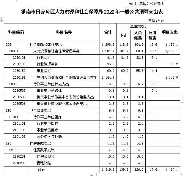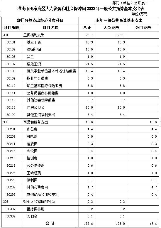 淮南市田家庵区人力资源和社会保障局2022年一般公共预算基本支出139.6万元,其中,人员经费126万元,公用经费13.6万元。
