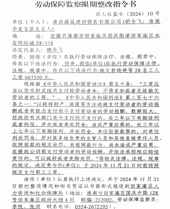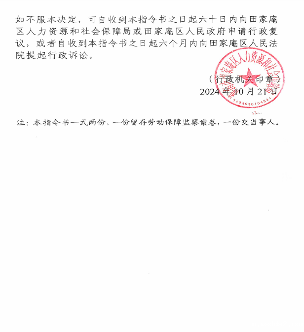 劳动保障监察限期整改指令书(田人社监令[2024]10号)