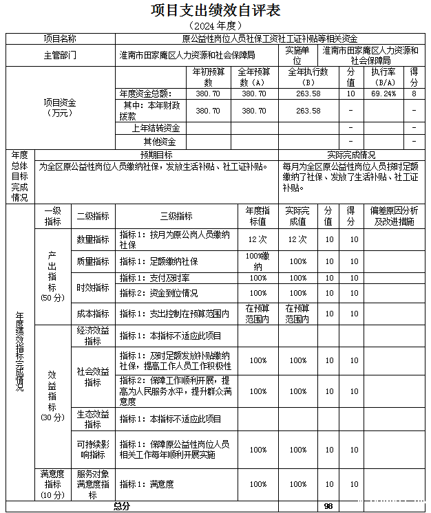 原公益性岗位人员社保工资社工证补贴等相关资金项目绩效自评综述:根据年初设定的绩效目标,项目绩效自评得分为98分。全年预算数为380.70万元,执行数为263.58万元,完成预算的69.24%。项目绩效目标完成情况:一是每月按规定足额为全区原公益性岗位人员缴纳社保、发放生活补贴、社工证补贴;二是及时发放补贴、按规定调整社保基数,及时缴纳社保,提高工作人员积极性。 发现的主要问题及原因:编制项目预算时预留社保基数调整及补贴增加的空间较大,预算执行率不够高。下一步改进措施:2025年编制项目预算时尽量压减预算资金预留空间。