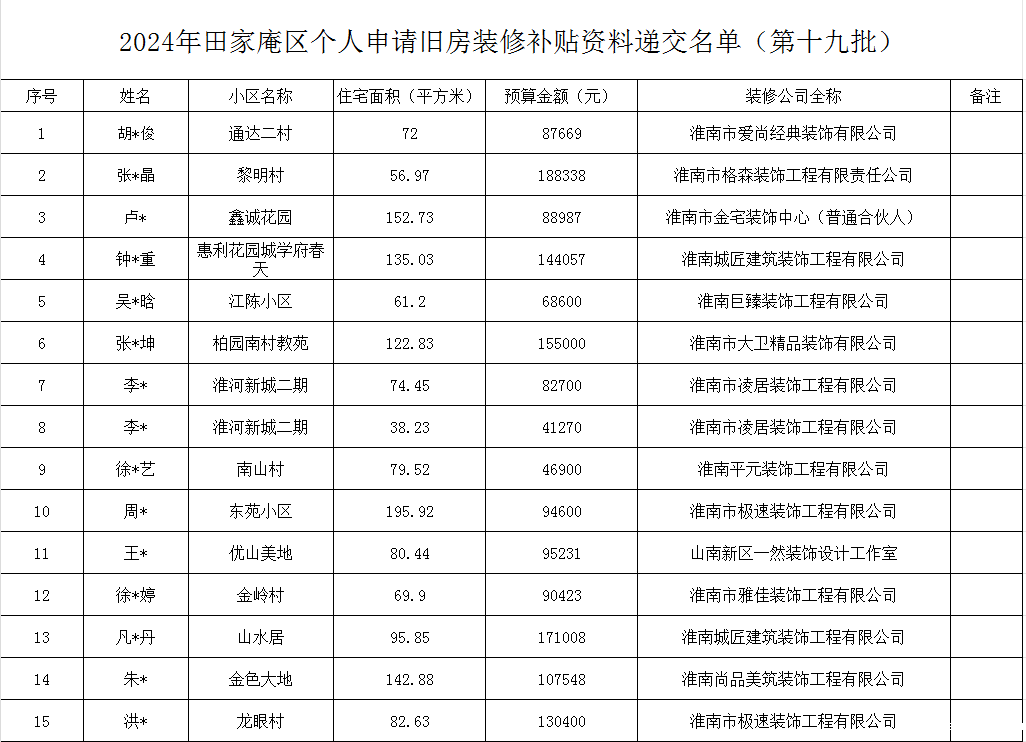 【主动回应】2024年田家庵区个人申请旧房装修补贴资料递交名单(第十九批)