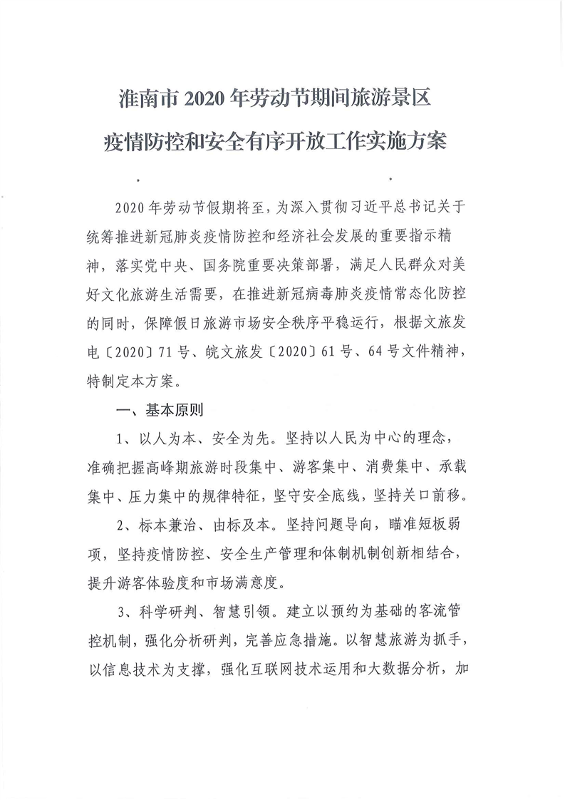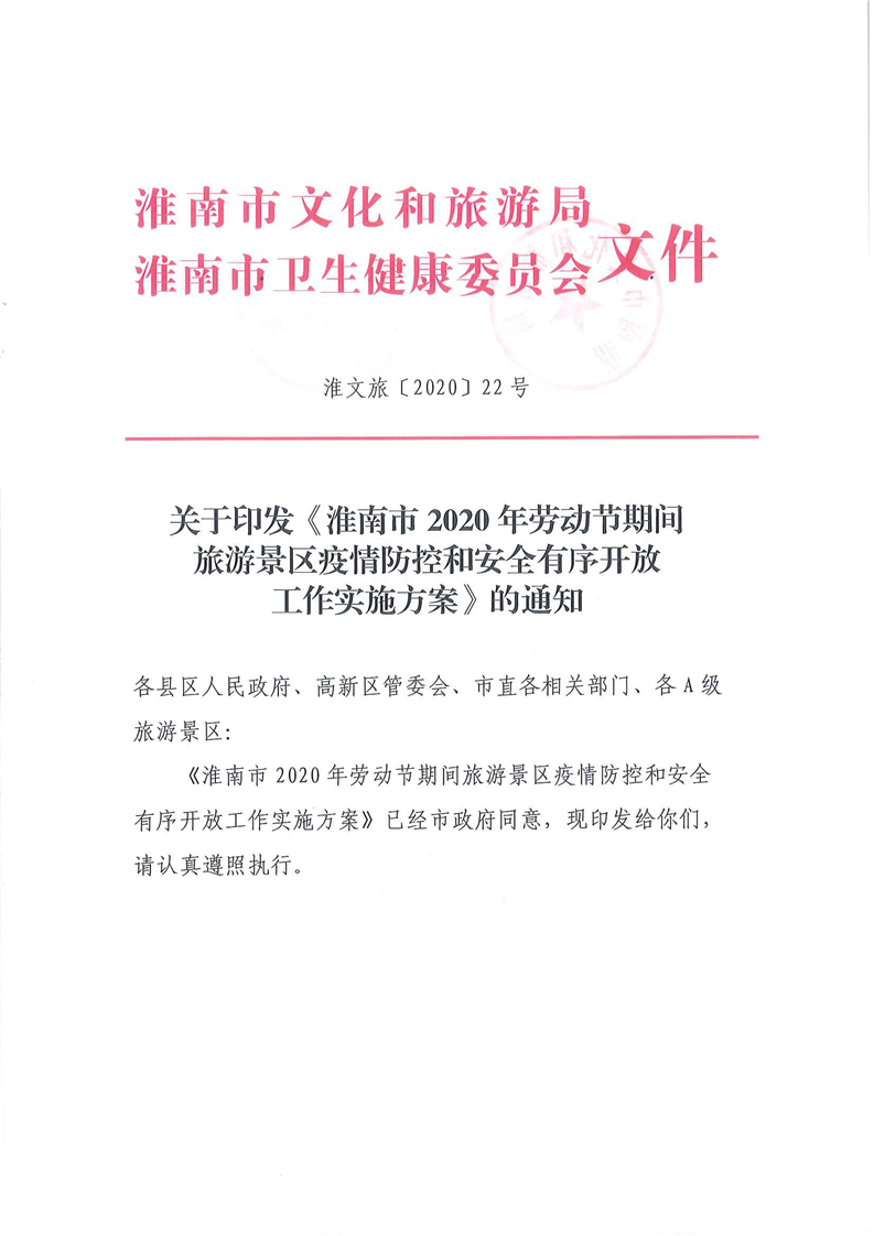 关于印发《淮南市2020年劳动节期间旅游景区疫情防控和安全有序开放工作实施方案》的通知