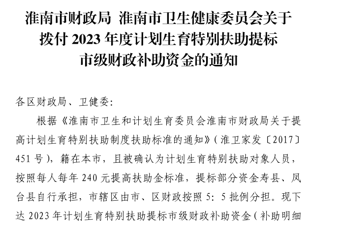 淮南市财政局淮南市卫生健康委员会关于拨付2023年度计划生育特别扶助提标市级财政补助资金的通知