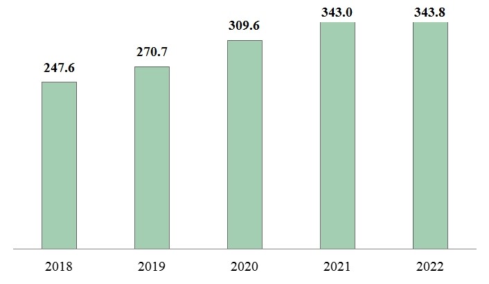 图3 2018-2022年田家庵区社会消费品零售总额(单位:亿元)