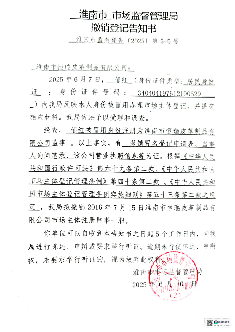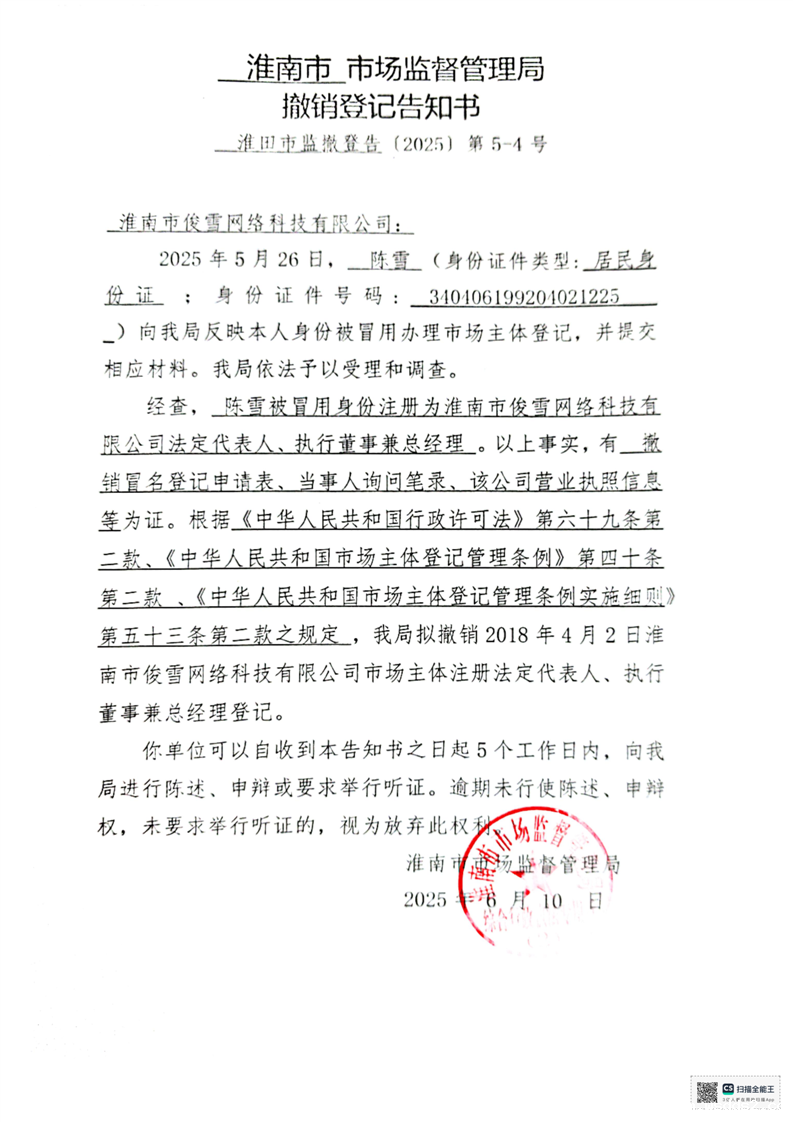 淮南市市场监督管理局撤销登记告知书(俊雪网络、恒瑞皮革)