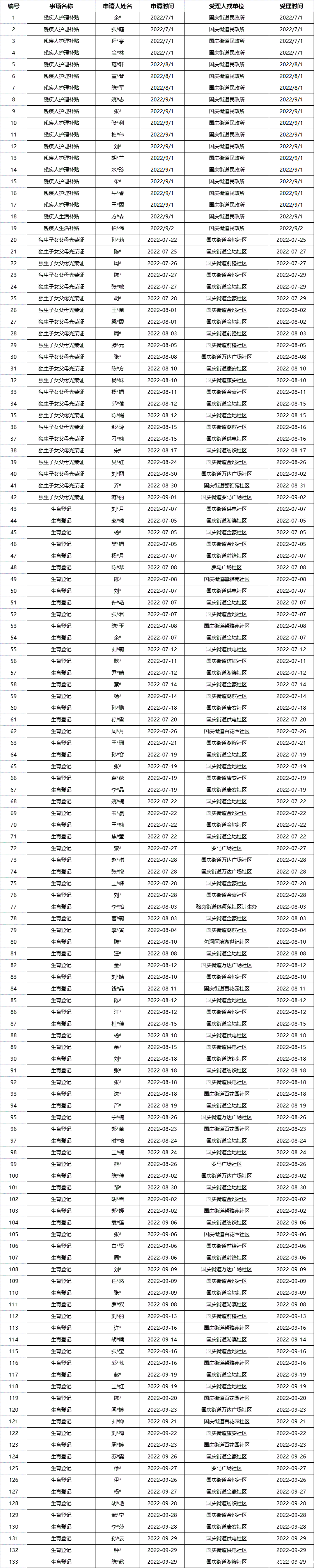 国庆街道2022年3季度权力事项办理结果汇总表