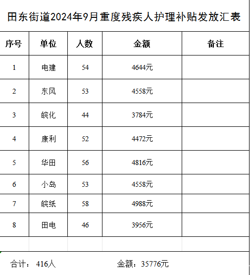 田东街道2024年9月重度残疾人护理补贴