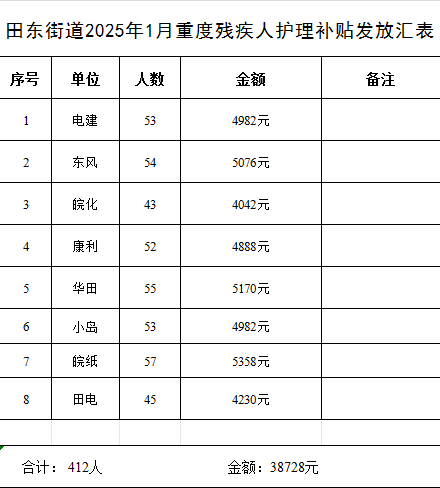 田东街道2025年1月重度残疾人护理补贴发放汇总表