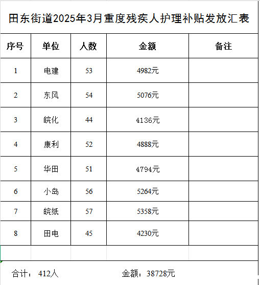 田东街道2025年3月重度残疾人护理补贴发放汇总表