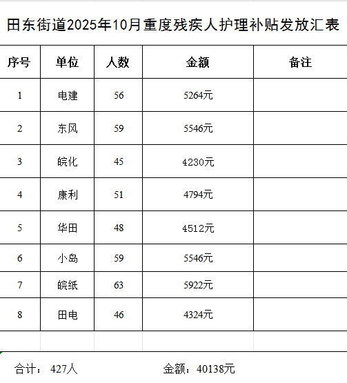 田东街道2025年10月重度残疾人护理补贴发放汇总表