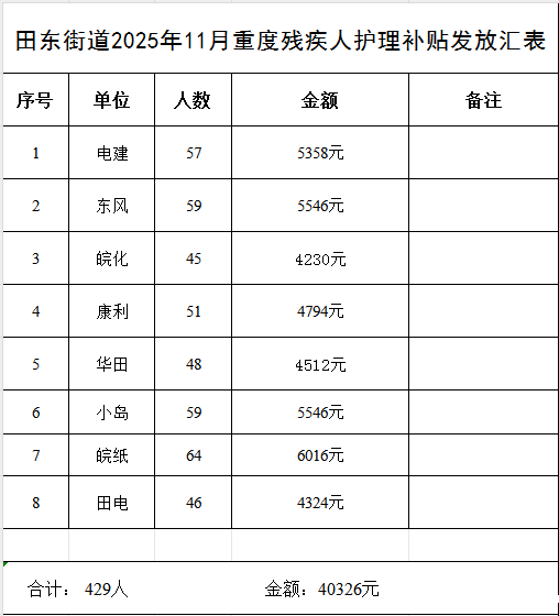 田东街道2025年11月重度残疾人护理补贴发放汇总表