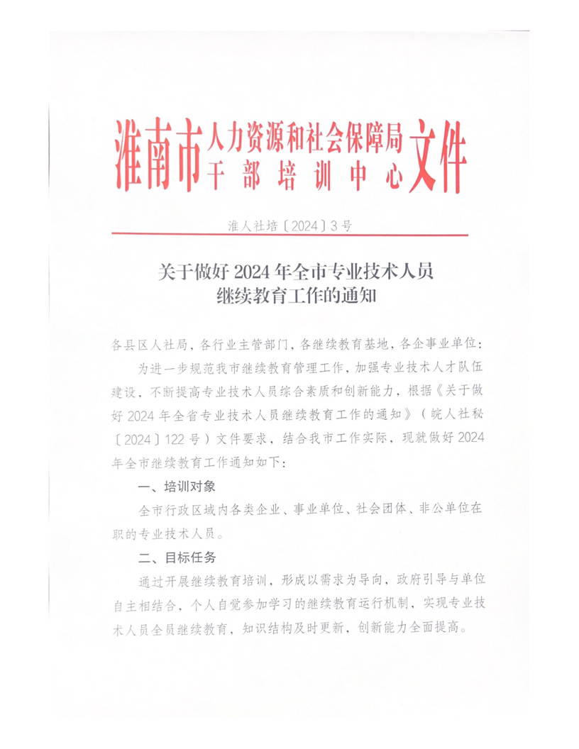 关于做好2024年全市继续教育工作的通知(淮人社培〔2024〕3号)
