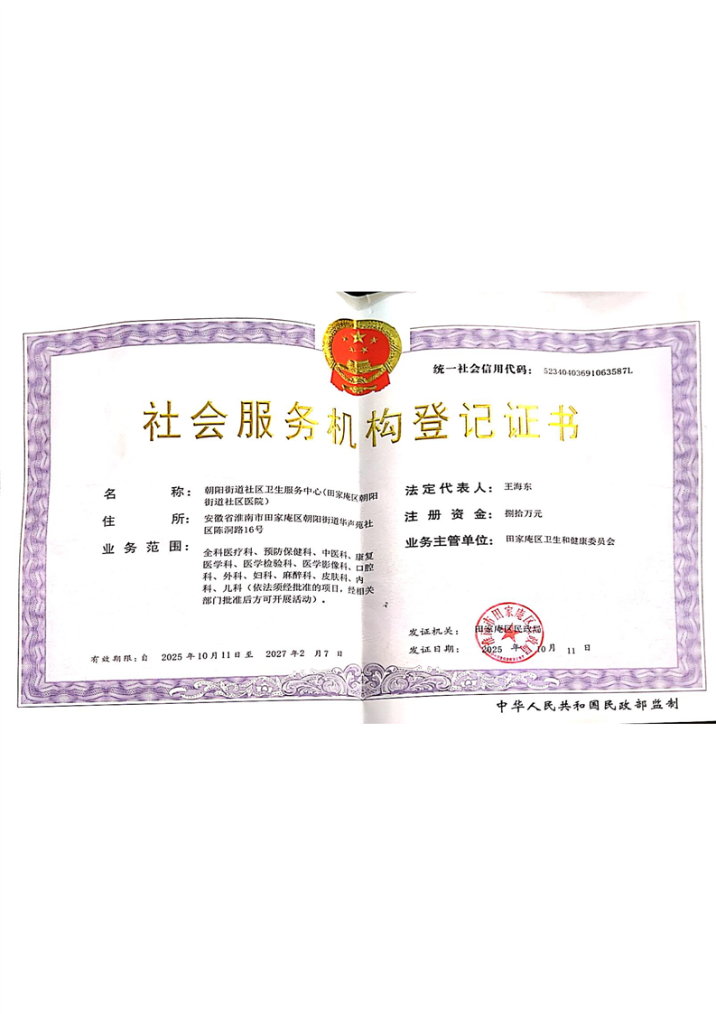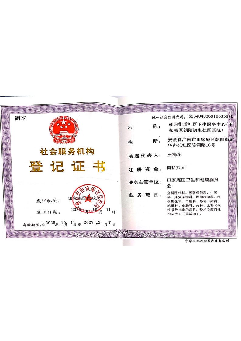 朝阳街道社区卫生服务中心社会服务机构登记证书正副本(统一社会信用代码)