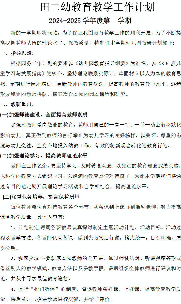 田二幼教学工作计划(2024-2025学年度第一学期)