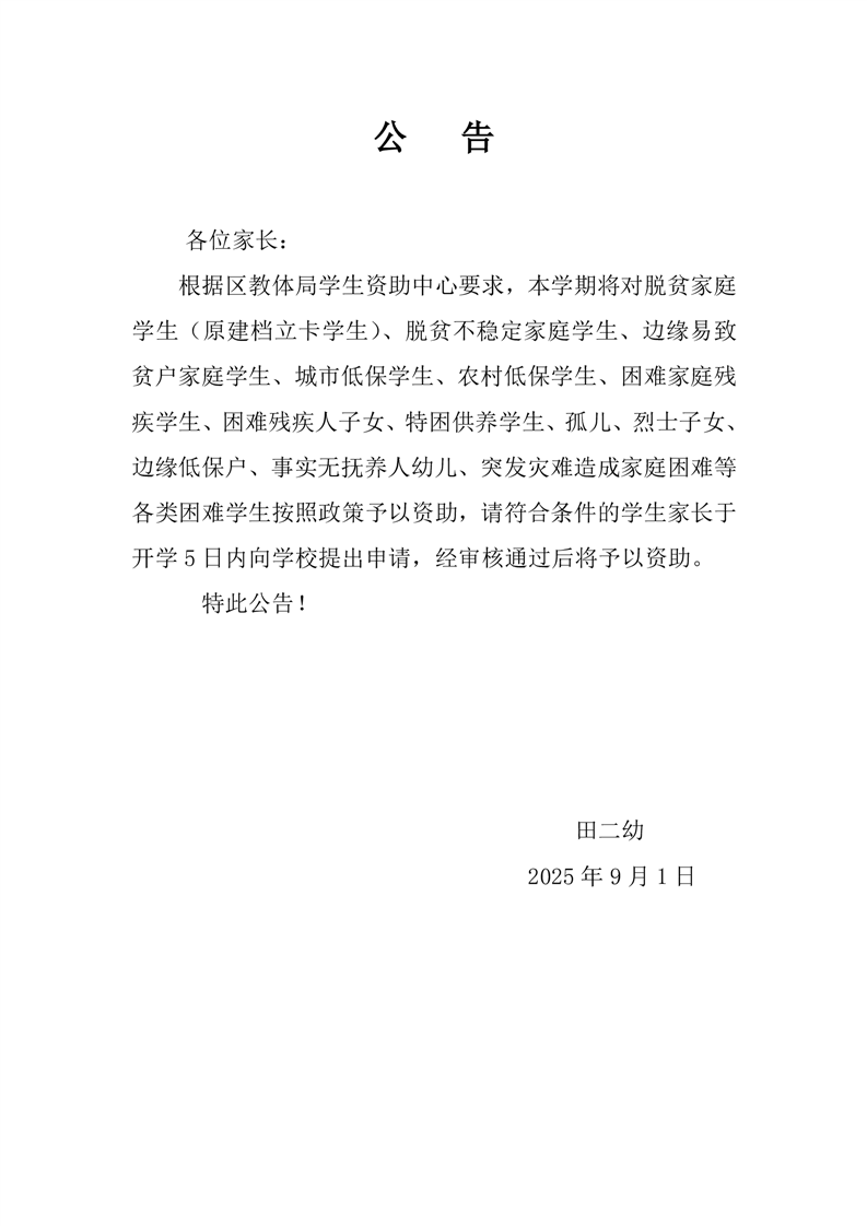 田二幼2025年秋季困难资助公告