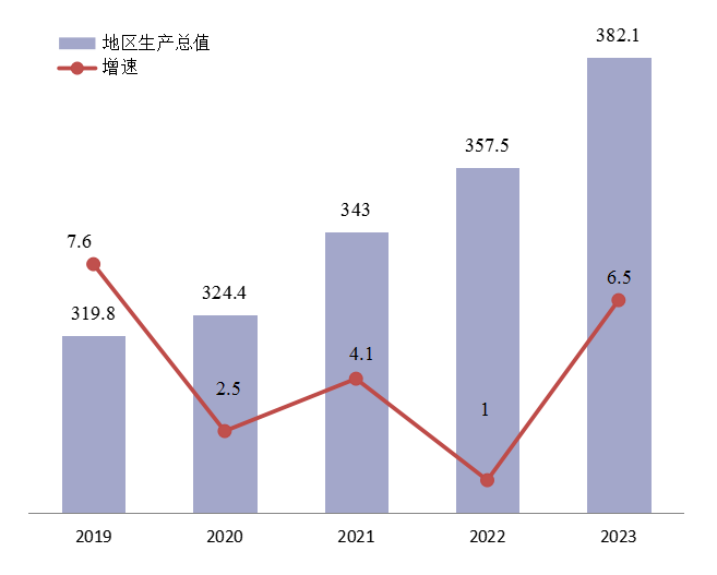 初步核算,全年实现地区生产总值(GDP)382.1亿元,按可比价格计算增长6.5%。其中:第一产业增加值6.0亿元,增长3.3%;第二产业增加值95.3亿元,增长4.4%;第三产业增加值280.8亿元,增长7.2%。三次产业比例为1.6:24.9:73.5。按户籍人口计算,全区人均GDP为63639元(按2023年底汇率基准价计算约合8985美元)。