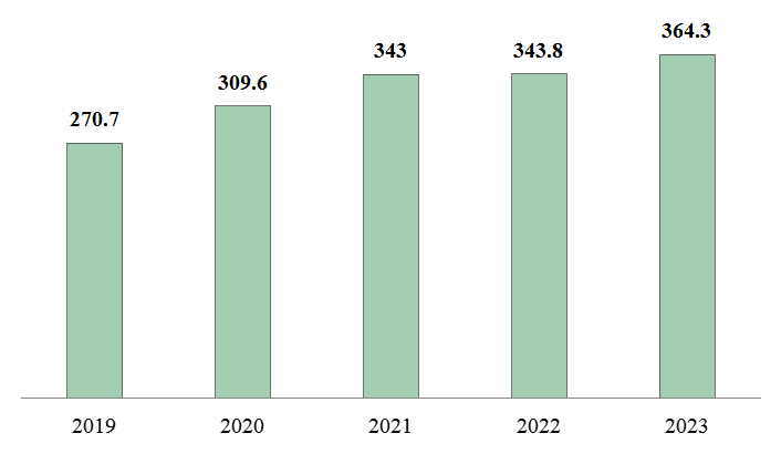 图3 2019-2023年田家庵区社会消费品零售总额(单位:亿元)