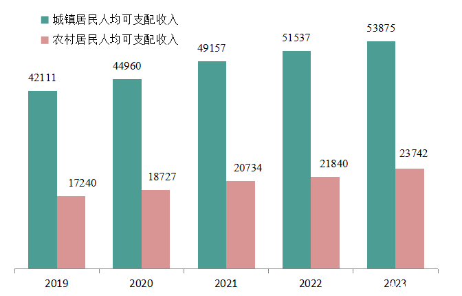 图5 2019-2023年田家庵区城乡常住居民人均可支配收入(单位:元)