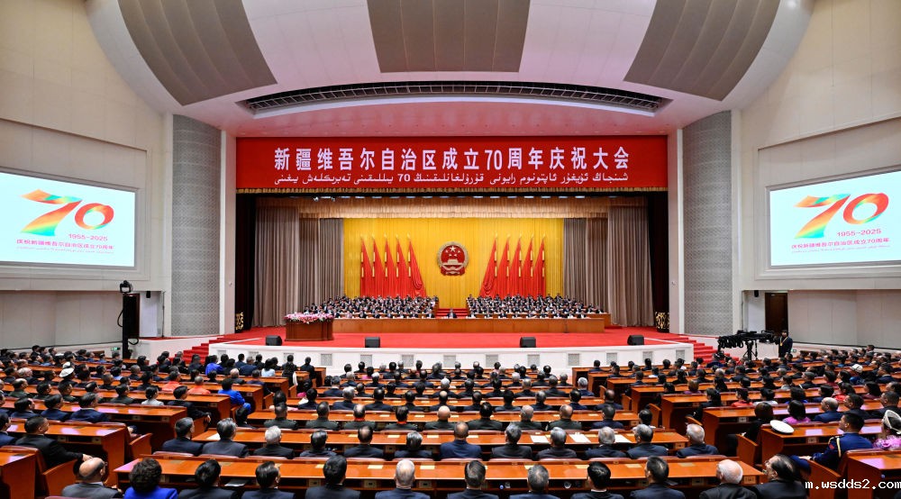 新疆人民会堂灯光璀璨,气氛隆重热烈。主席台上方悬挂着“新疆维吾尔自治区成立70周年庆祝大会”横幅,后幕正中是熠熠生辉的中华人民共和国国徽,10面红旗分列两侧。会堂后方悬挂着标语:“更加紧密团结在以习近平同志为核心的党中央周围,为建设团结和谐、繁荣富裕、文明进步、安居乐业、生态良好的社会主义现代化新疆而不懈奋斗!”