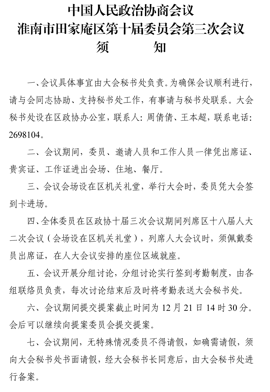 中国人民政治协商会议淮南市田家庵区第十届委员会第三次会议须知