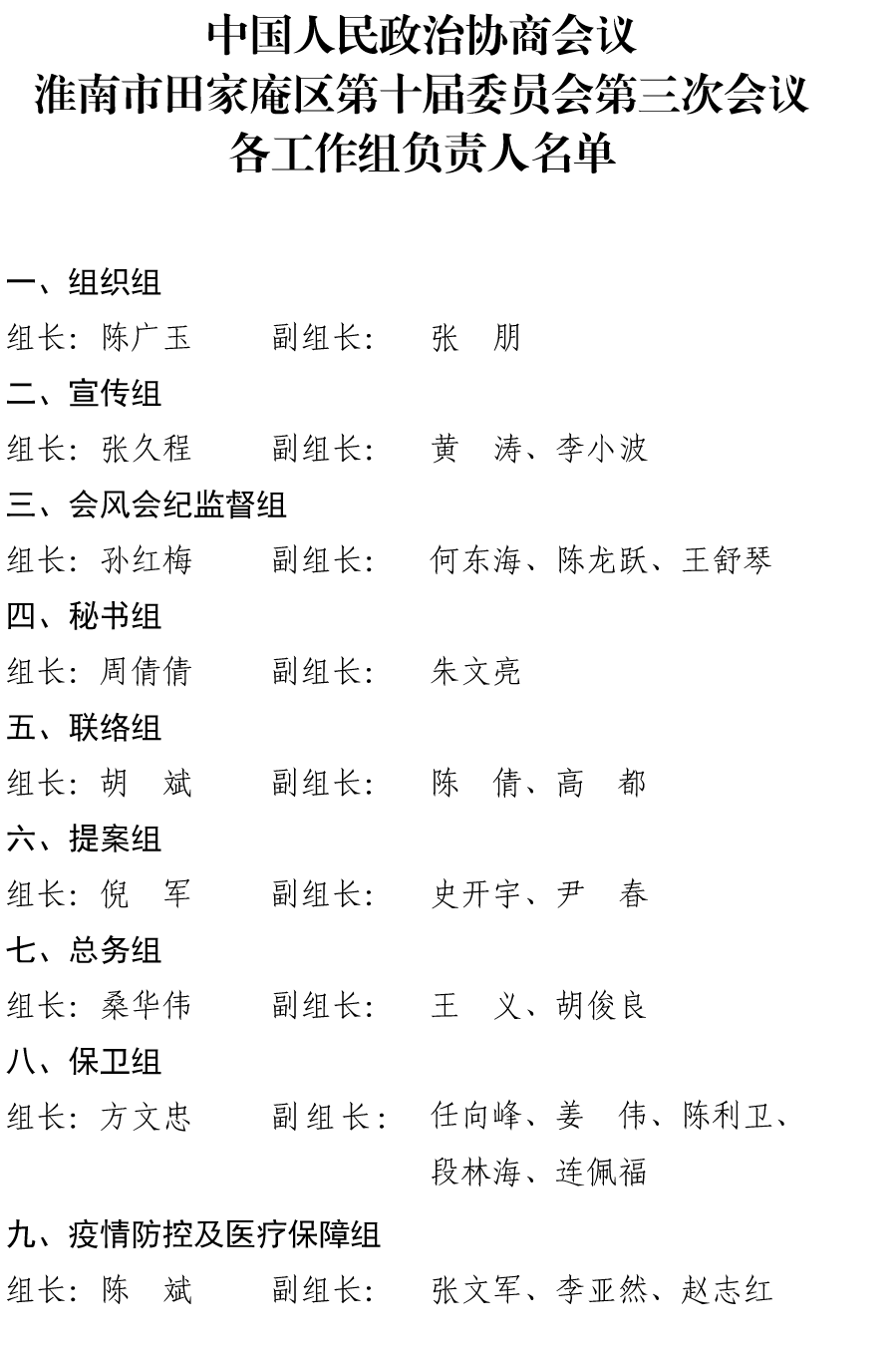 中国人民政治协商会议淮南市田家庵区第十届委员会第三次会议各工作组负责人名单